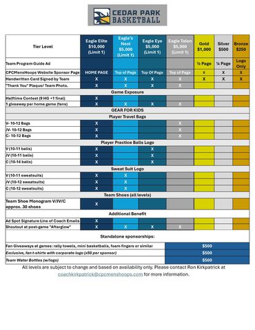 Organizations: Send your donation to one option below then email and a high Resolution JPEG file to coachkirkpatrick@cpcmenshoops.com